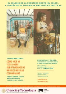 El Colegio de la Frontera Norte, a través de su Sistema de Bibliotecas, les da la bienvenida a la primera sesión del ciclo Cómo hice mi tesis sobre subjetividades de mujeres músicas colombianas, Vengo desde abajo recolectando tajos de mi tiempo, con la egresada del Doctorado en Estudios Culturales de El Colef, Nathaly Gómez Gómez, acompañada de Roberta Leono y Juan Antonio Del Monte.